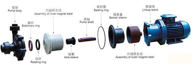 磁力泵以靜密封取代動(dòng)密封,使泵的過(guò)流部件處于完全密封狀態(tài),徹底解決了其它泵的機(jī)械密封無(wú)法避免的跑,冒,滴之蔽病,磁力泵選用耐腐蝕,鋼玉陶磁,增強(qiáng)聚丙稀作為制造材料,因此它具有良好的抗腐蝕性能,并可以使實(shí)輸送介質(zhì)免受污染。